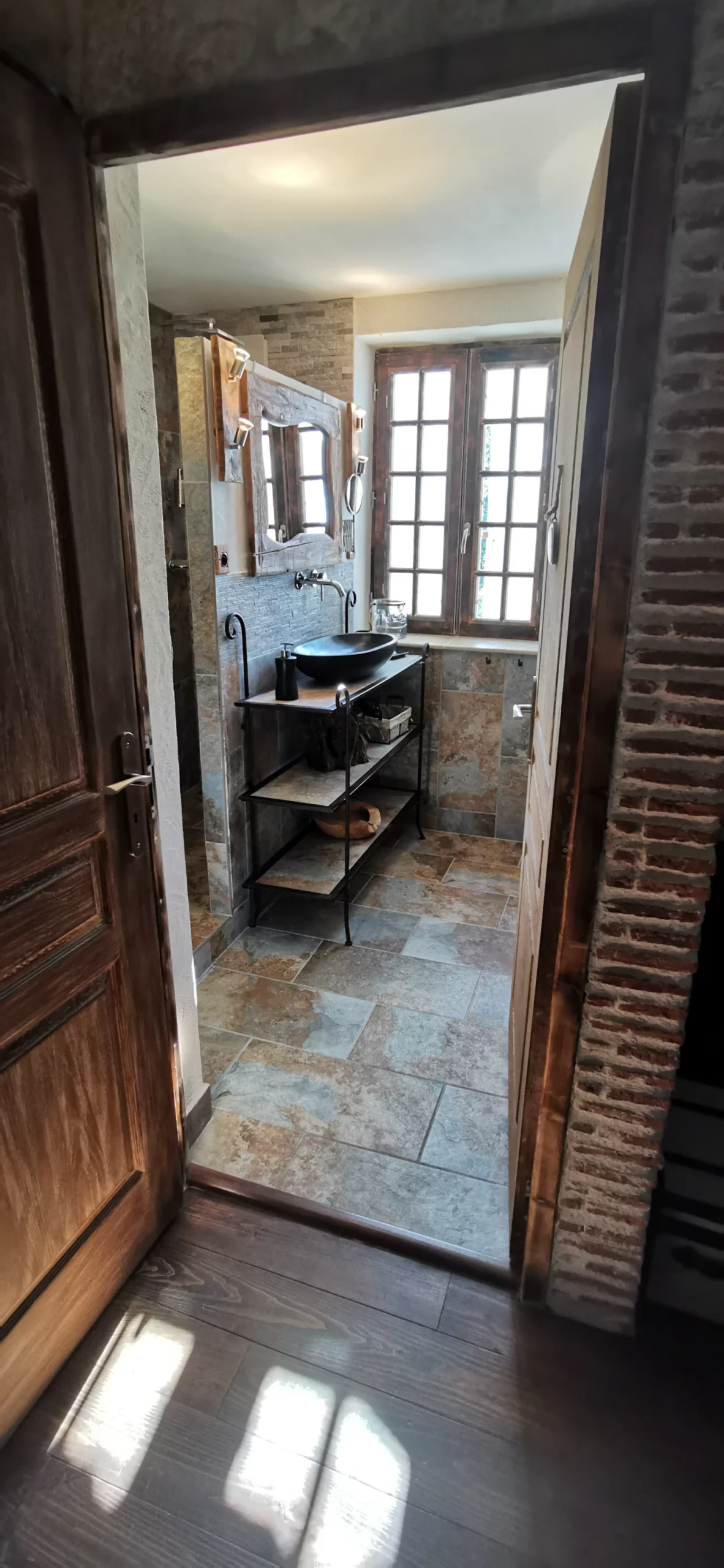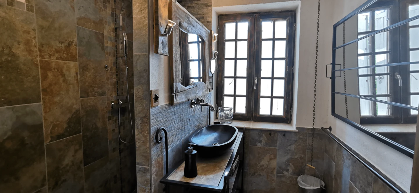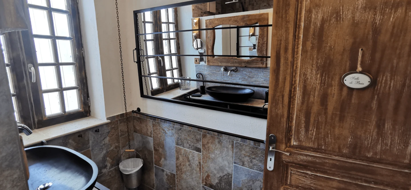 Au 1er étage de la tour de notre demeure, cette chambre et sa salle d’eau minérale avec une vaste douche italienne, offre une vue sur le parc champêtre du domaine et la campagne environnante.