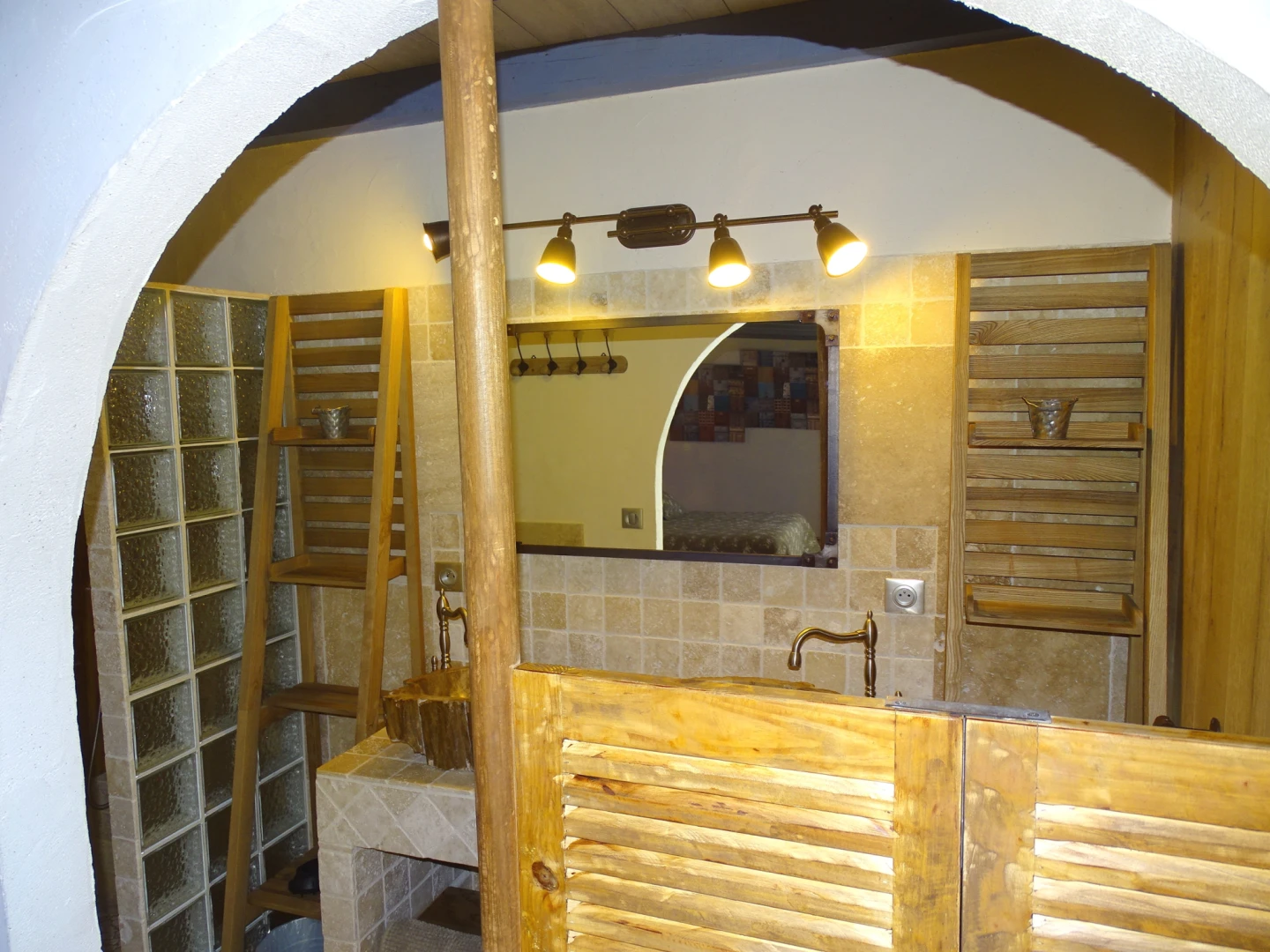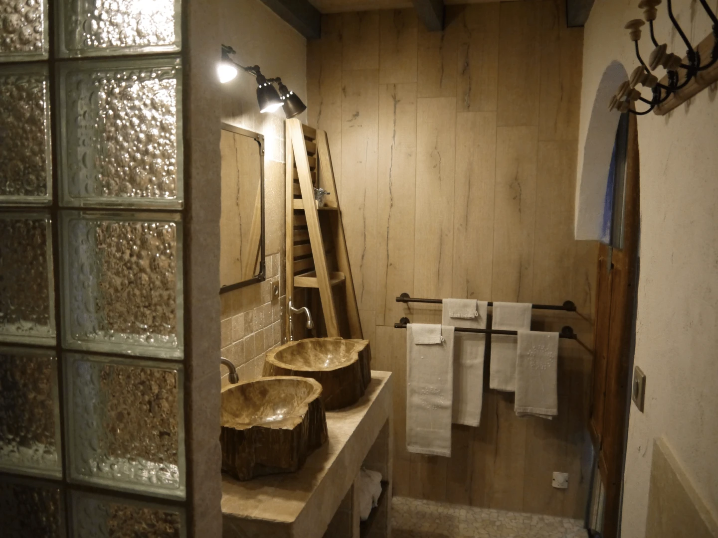 La salle d’eau entièrement minérale, avec ses 2 vasques en pierre fossilisée et sa vaste douche italienne, fleure bon l’authenticité.