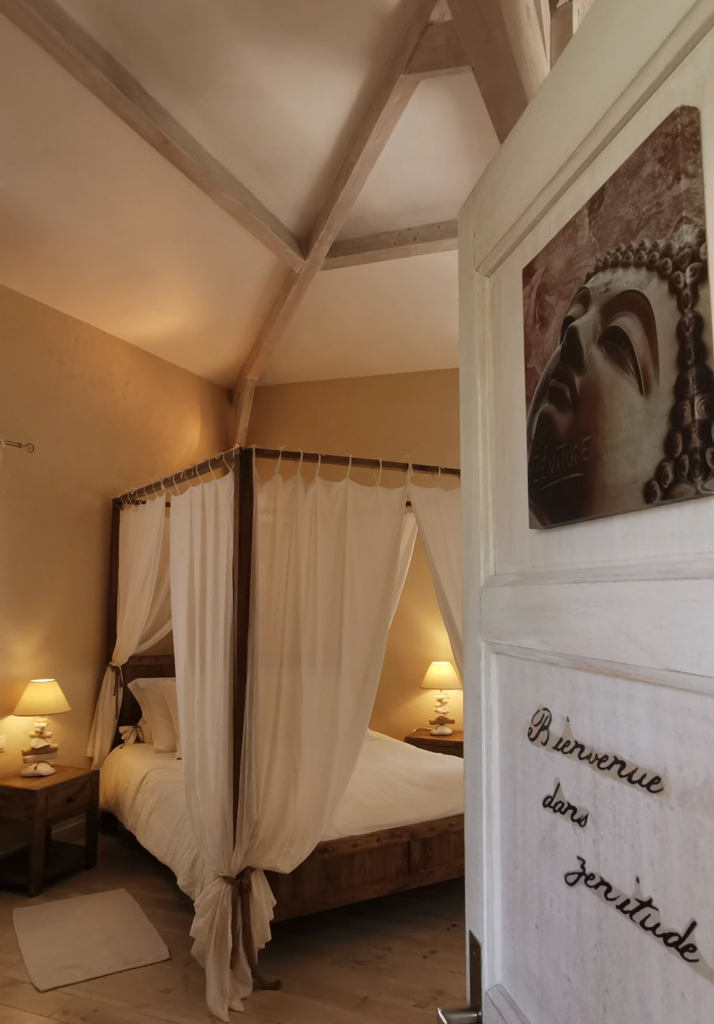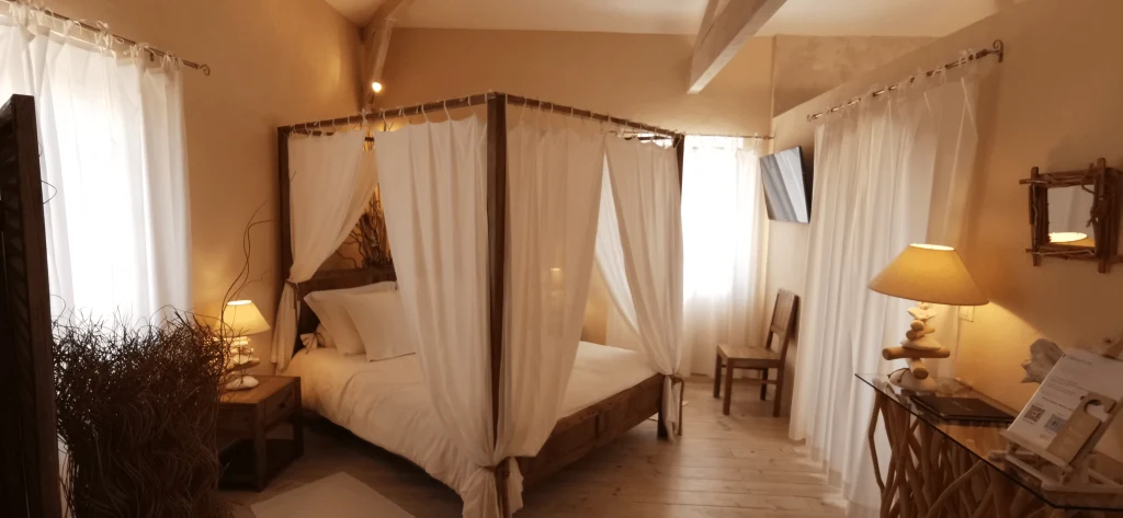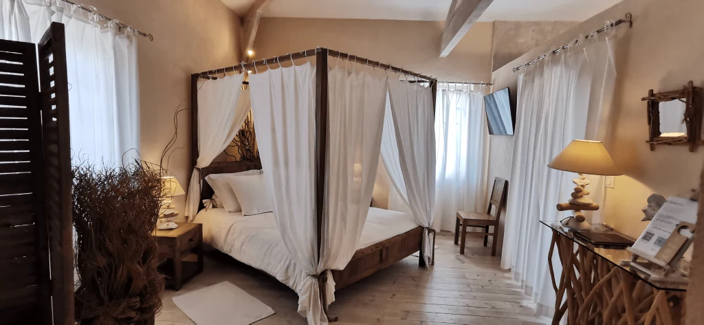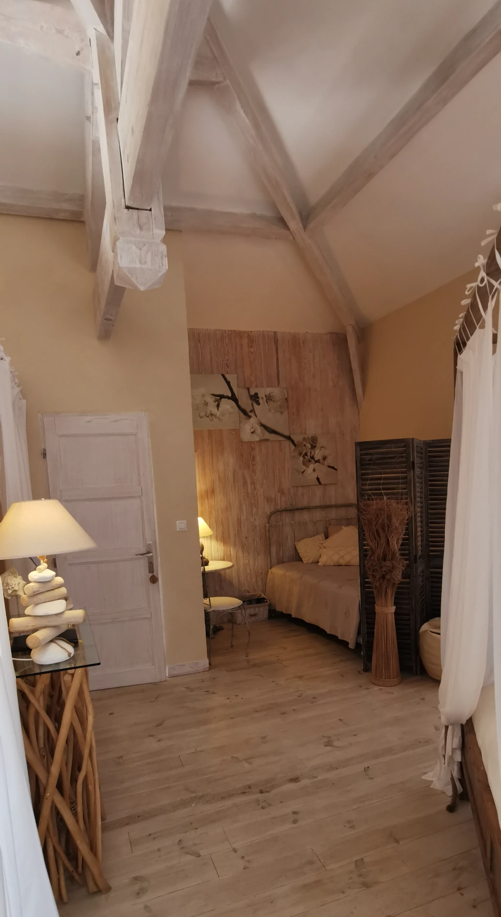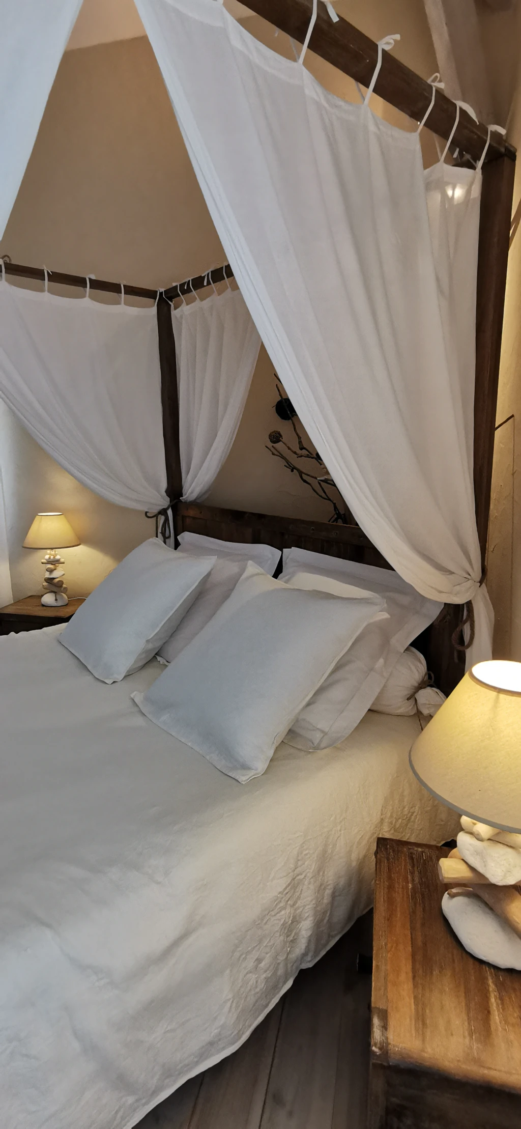Le lit stylé à baldaquin, et le second couchage séparé du reste de la pièce par un paravent, vous charmerons autant que la belle salle d’eau avec sa grande douche italienne en galets.