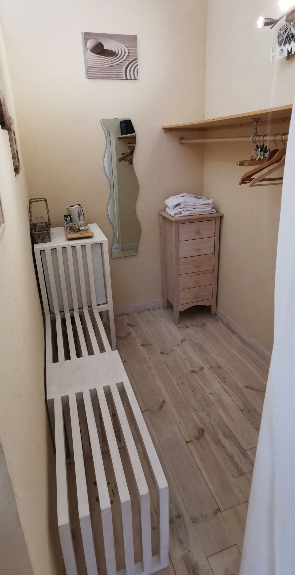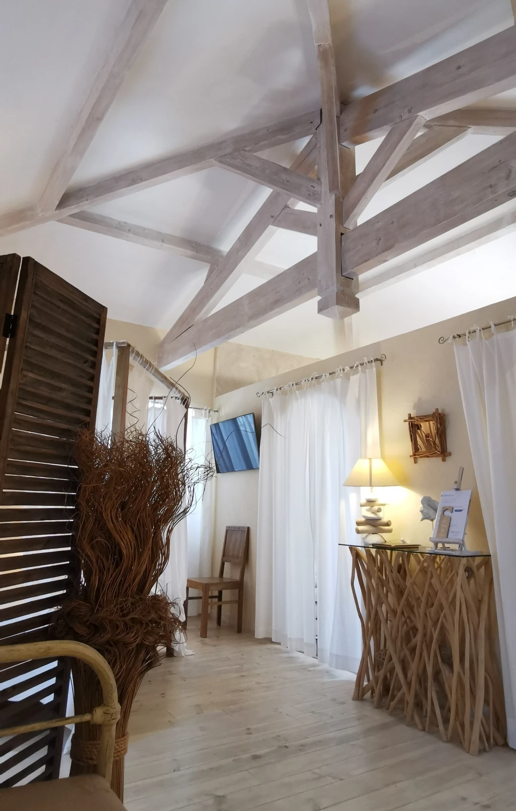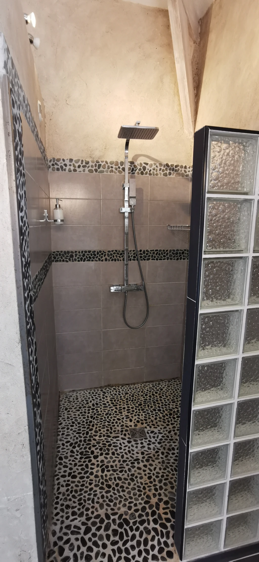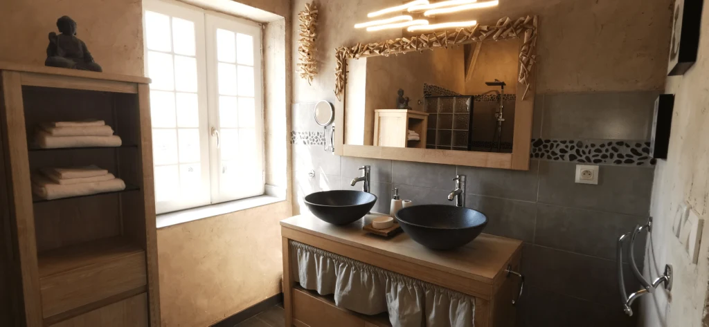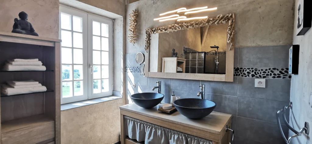 Le lit stylé à baldaquin, et le second couchage séparé du reste de la pièce par un paravent, vous charmerons autant que la belle salle d’eau avec sa grande douche italienne en galets.